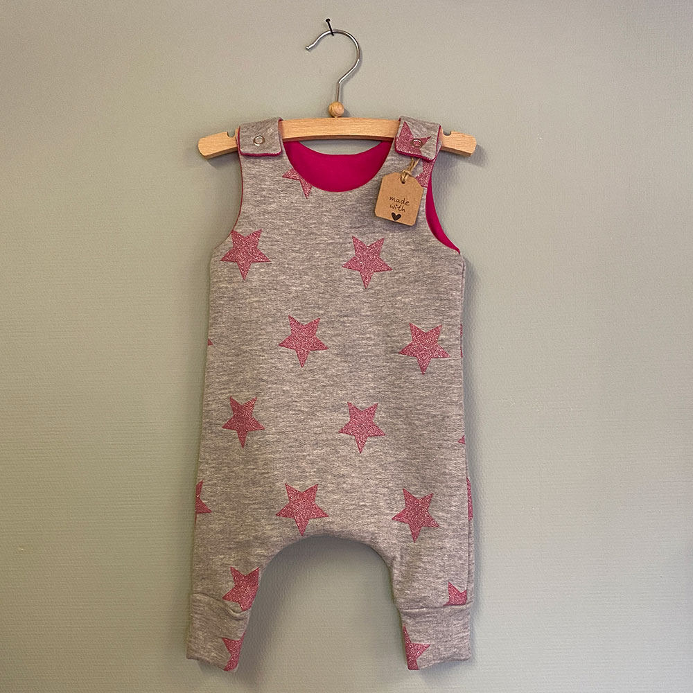 Schattige Grijs met roze sterren Jumpsuite. Het bovenstukje is gevoerd met zachte tricot.
