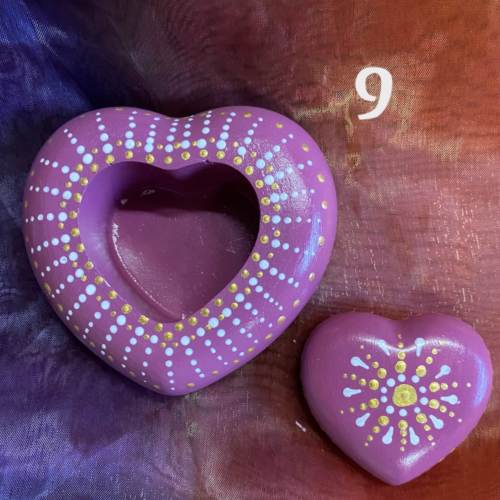 Een mooi van gips gegoten hartendoosje met deksel, geverfd en voorzien van gestippelde patronen. De onderkant is voorzien van een vilten lapje om krassen ter voorkomen.