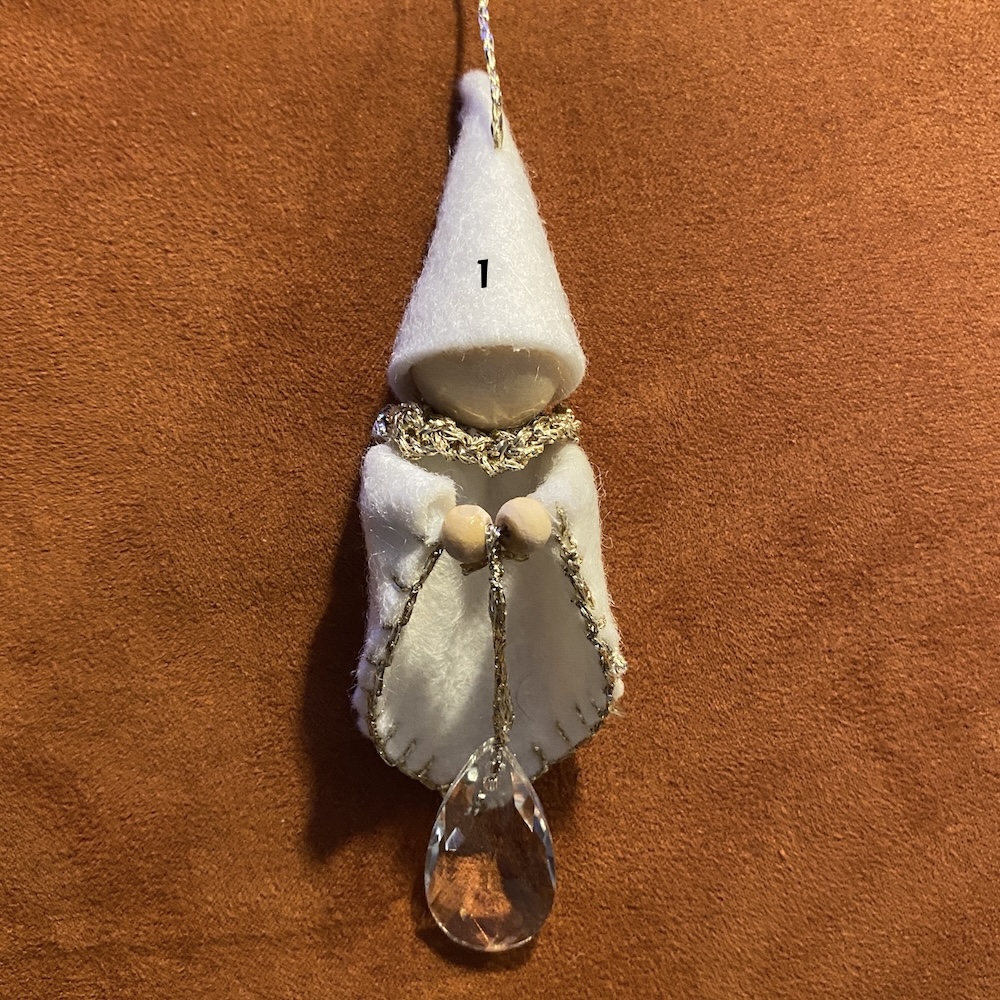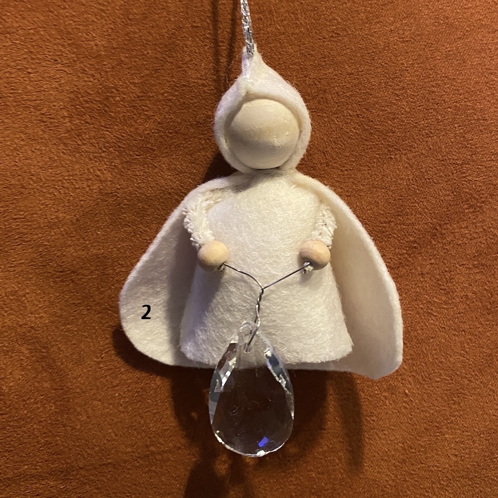 Mooi engeltje van vilt voor in de kerstboom of op de seizoenstafel. De regenboogkristal schittert mooi in het licht.